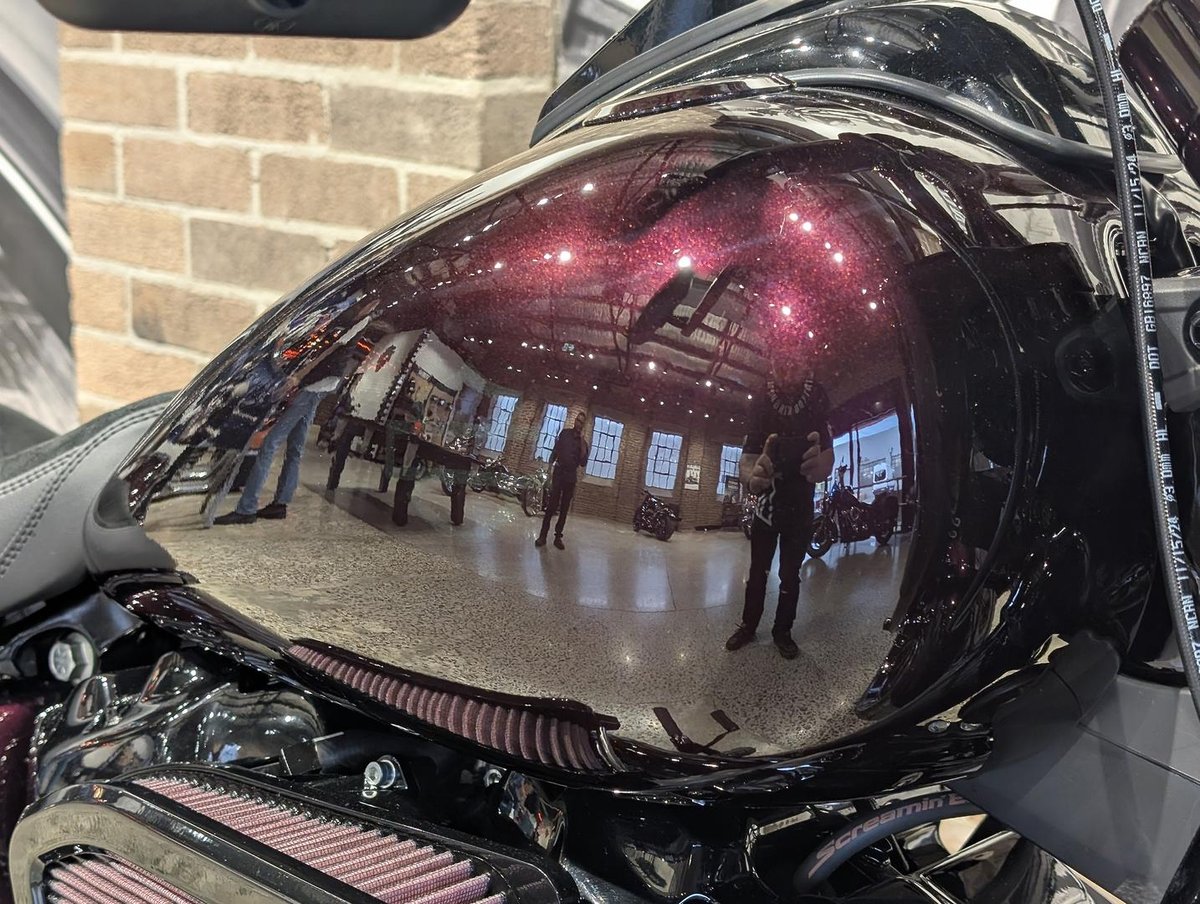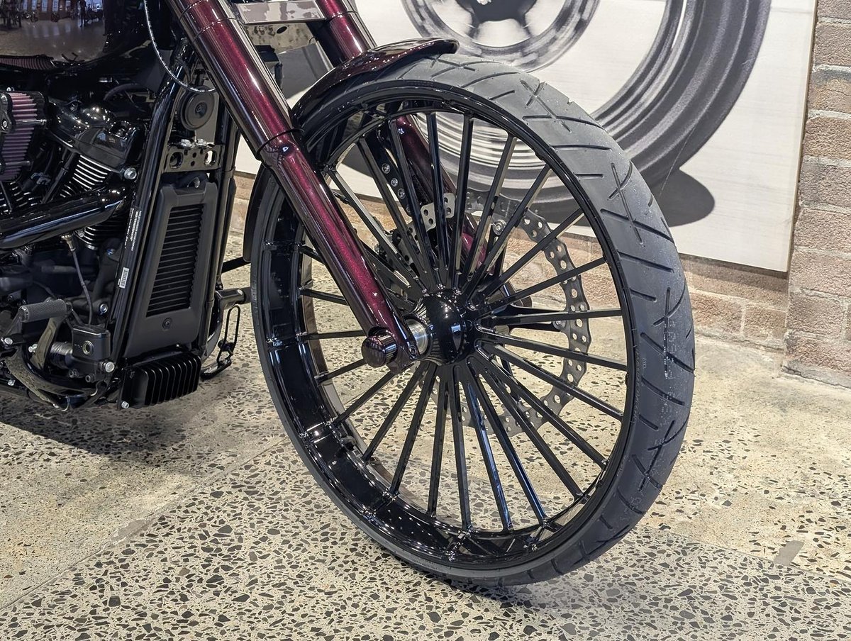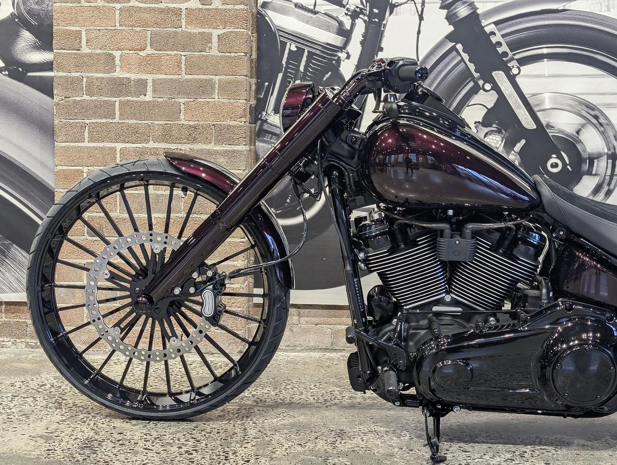This Breakout is not a standard bike — it’s a full shop custom built by our dealership and revealed at Harley Nights, designed to showcase what our workshop can do. With a 26-inch front wheel, Kurrans front end, air ride suspension and full custom paint, this bike has serious show-bike presence while still being fully rideable.